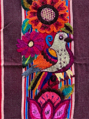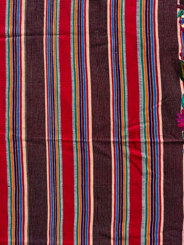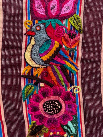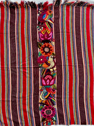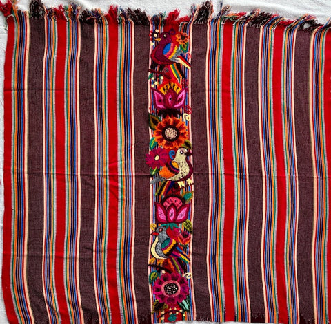 This is a more older tzute of Almolonga with the birds and flowers woven into the cloth. This piece is approximately 30 to 40 years old and shows some sign of wear but for the most part, it is in great shape for it's age. Measures 45" x 44".