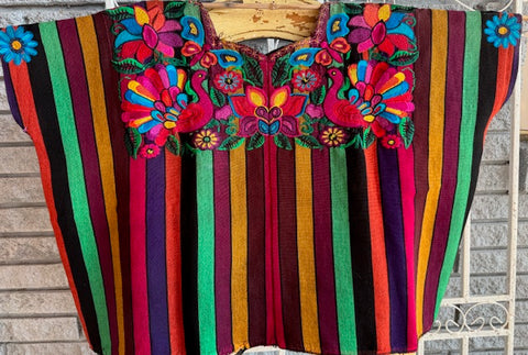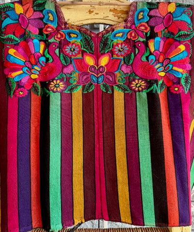 Modern Chichicastenango huipil consisting of 2 back-strap woven panels on striped base cloth. Peacocks, butterflies and flowers are woven into the huipil. Both sides have the same design (both sides pictured). This is a used huipil in good condition with some loose threads but design is very charming.