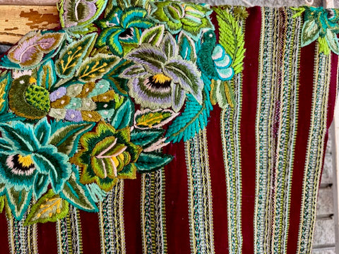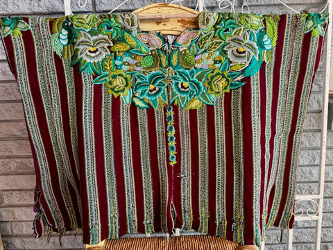 Vintage Patzun, Guatemala huipil with hand-embroidered flowers and birds on very soft red and white base cloth that was woven on a back-strap loom.  Sides are sew closed but very easy to open if you need more arm space or prefer to wear it poncho style. Some loose threads but otherwise in very good shape.   Measures 22" from shoulder to bottom of the huipil on each side and 30" wide.  Both sides of the huipil are pictured.
