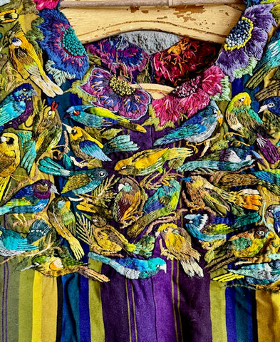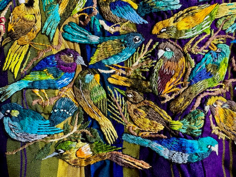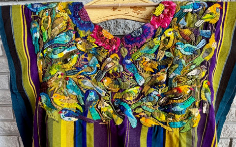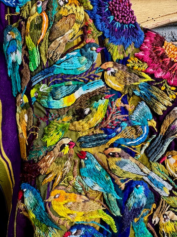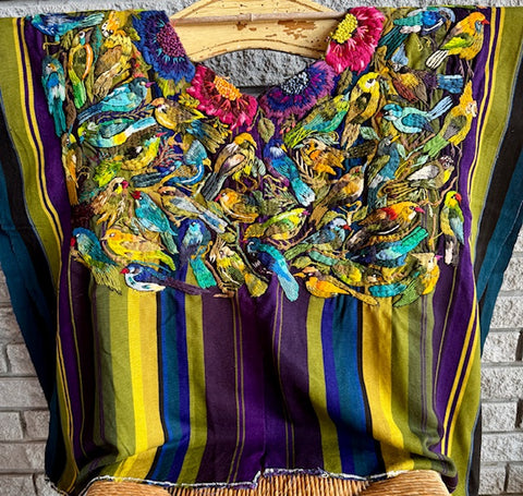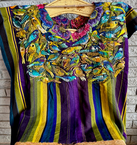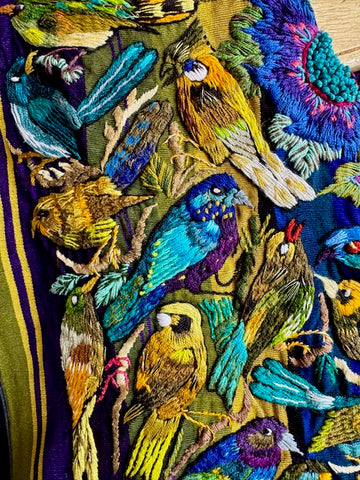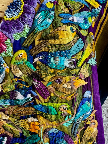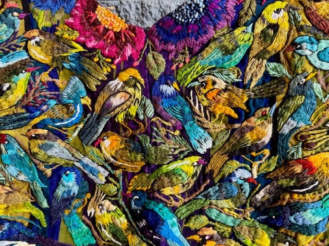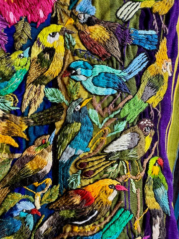 SANTIAGO ATITLAN, Guatemala with hand-embroidered birds and flowers. Colorful almost 3D quality due to the thickness of the embroidery. Beautiful piece of art! Open on the sides. Each side from shoulder to bottom is 26" long and 31" wide. Both sides of huipil are shown.